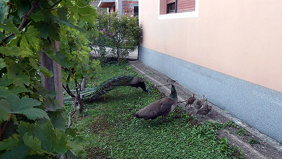 Ispred kuće nas je iznenadio jedan par paunova. Paunica se šetala sa petoro mladih. Paun je bio u fazi kad odbacuje svoj rep pa su za njim ostajala prelepa duga pera dok je izokola motrio na svoju paunicu i mladunce.