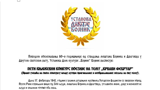 Povodom obeležavanja osamdesetogodišnjice od stradanja nedužnih građana iz Bojnika i Dragovca u drugom svetskom ratu, Ustanova Dom kulture „Bojnik“ Bojnik i ove godine raspisuje književni konkurs za poeziju na temu „Krvavi Februar“, svi zainteresovani za učešće na konkurs mogu svoje pesme slati na adresu po svemu kao u tekstu konkursa.