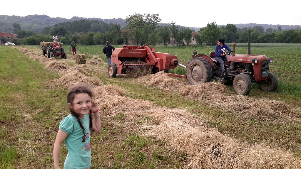 Traktor sa balirkom vozila je jedna od kćeri dok su ostali  sa drugim traktorom i prikolicom tovarili bale sena, bili su brži od kiše.  Sa ponosom su pokazivali traktore i druge poljoprivredne i priključne mašine. Obrađuju veliku površinu, samo pod voćem imaju 60 hektara.  Kad krenu u voćnjak idu sa tri traktora sa tri atomizera, a radi se dok se ne zaštiti svih 60 hektara,  ako treba i 24 časa bez zastoja i odmora. Tu su sve priključne mašine da rad bude lakši, da se posao uradi brže i prinos bude veći.